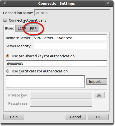 Enter the IP of the server you are connecting to and the IPSec key: 69000903 then click onto the ‘PPP’ tab. You can find the server information in your ‘Welcome to VPNUK’ email or in the ‘Client CP‘ on the VPNUK website.