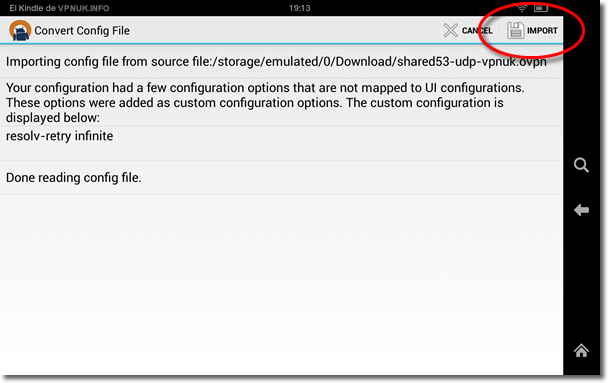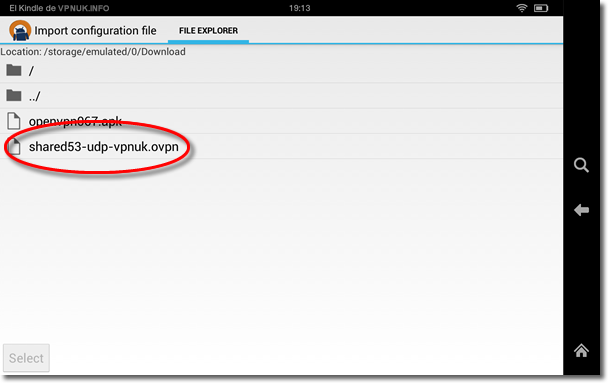 Click onto any of the ‘.ovpn’ files and then click onto the ‘Select’ button. You will find the configuration file in the ‘Download’ folfer on your Kindle.
