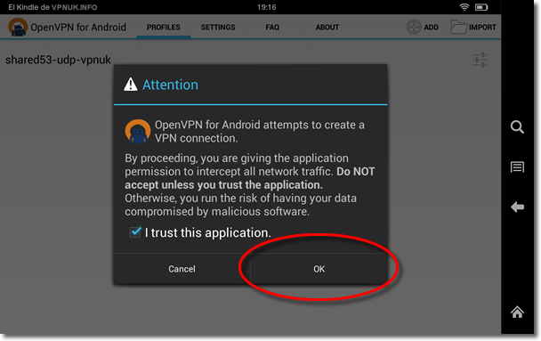 VPNUK Limited users can download the .apk installer file ‘OpenVPN for Android’ by Arne Schwabe from our server directly to your Kindle or to a computer for transfer over USB. Download file: [Download not found]