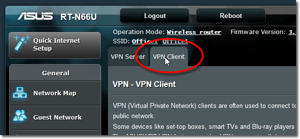 Login to your ASUS router adminstration and from the ‘Advanced Settings’ panel go to ‘VPN’.