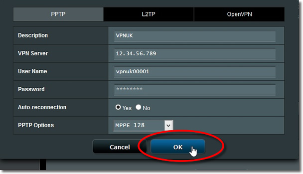 2. VPN Server – Enter the VPNUK server IP that your account has access to. You can find the server information in your ‘Welcome to VPNUK’ email or in the ‘Client CP‘ on the VPNUK website.